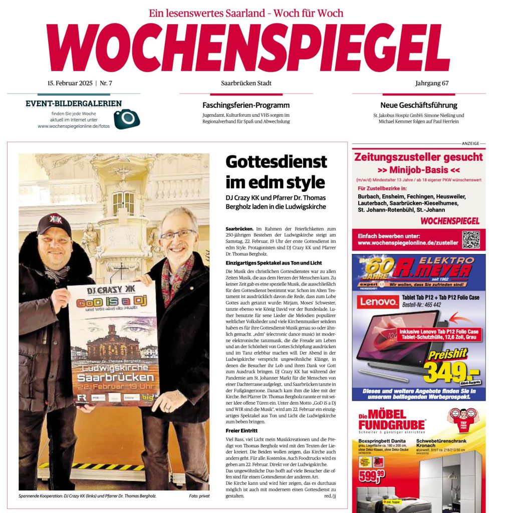 Der Countdown läuft… DJ Crazy KK legt in der Ludwigskirche 22.02.2025 um 19 Uhr auf. Das Thema „DOD is a DJ und wir sind die Musik“ wird ein Audiovisuelles Erlebnis in einem Gottesdienst der besonderen Art…