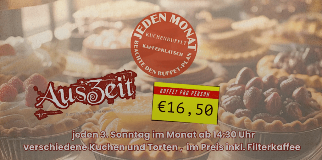 Sei dabei jeden 3. Sonntag im Monat ab 14:30 Uhr in der Aus Zeit Wadgassen. Genieße eine gemütliche Zeit mit leckerem Kaffee und einem vielfältigen Buffet. Lass es dir schmecken und tausche Dich in entspannter Atmosphäre mit anderen Gästen aus.