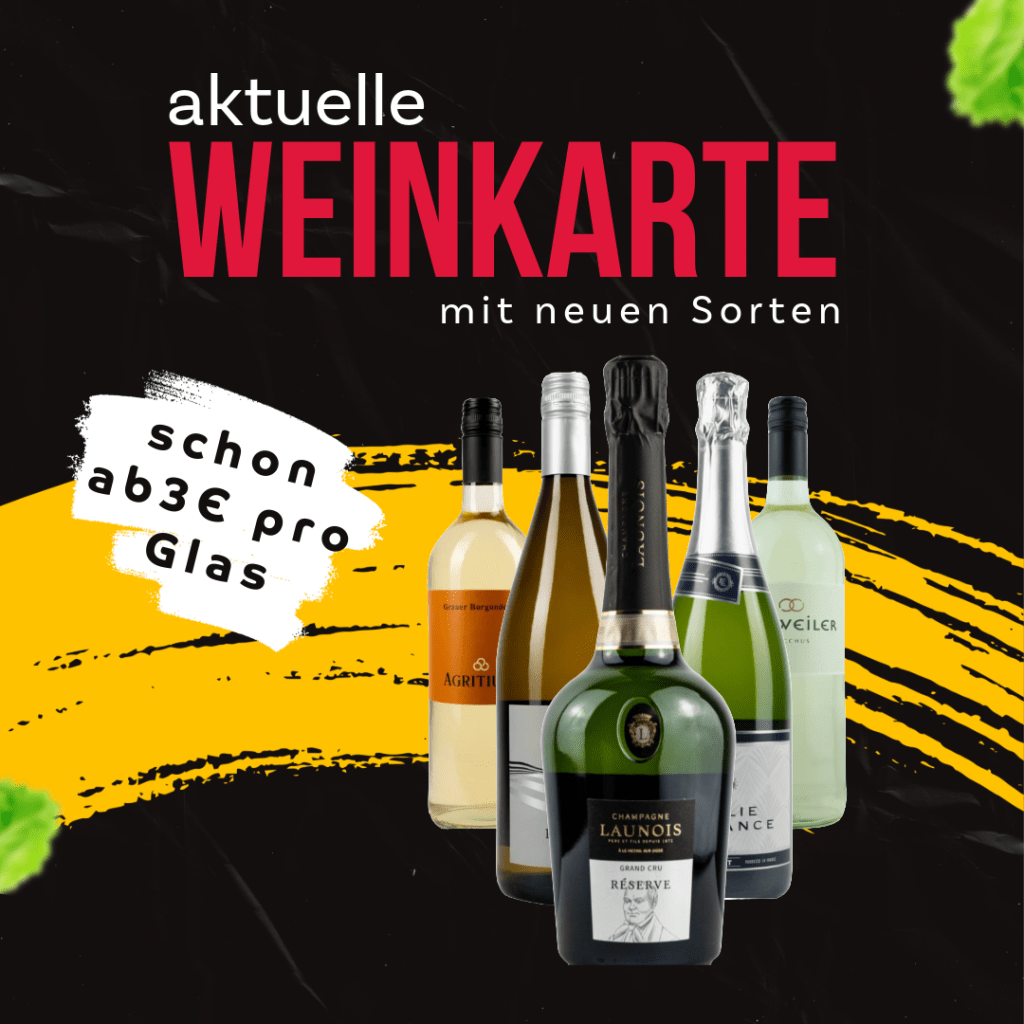 Genießen Sie schon ab 3 Є pro Glas unsere Schaumweine und ab 5,50 Є pro Glas unsere erlesene Weine. Wir haben gemeinsam mit unserer Weinagentur eine ausgewogene Weinkarte erstellt. Durch die professionelle Beratung unserer Weinagentur, können wir nun auch fast jeden Weingeschmack befriedigen. Kommen Sie vorbei und trinken Sie bei uns auf der Terrasse beim Sonnenuntergang unsere ausgewählten Weinsorten.